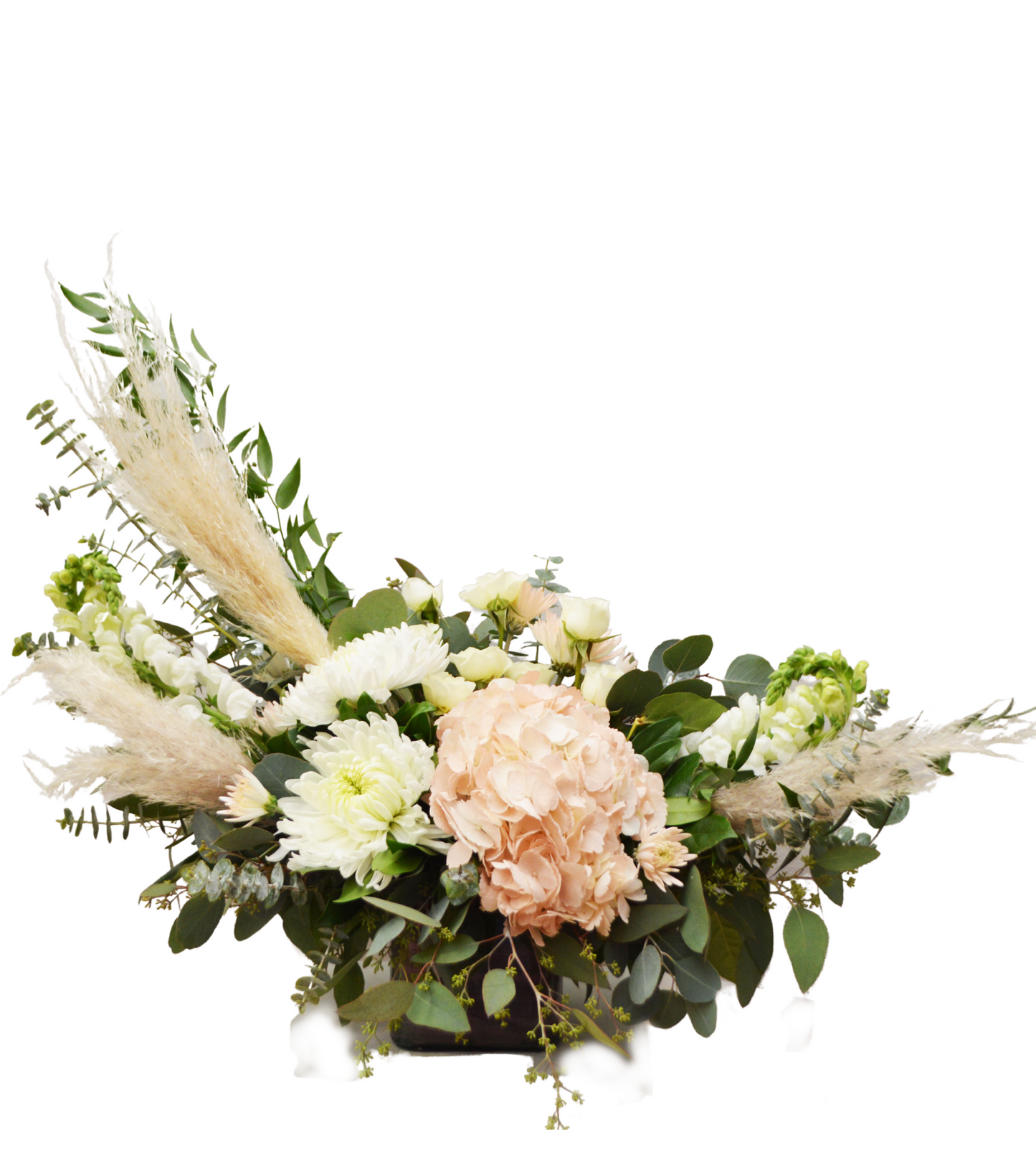This arrangement features a texture and unique mix of fresh and dried goods in blush and cream colors.